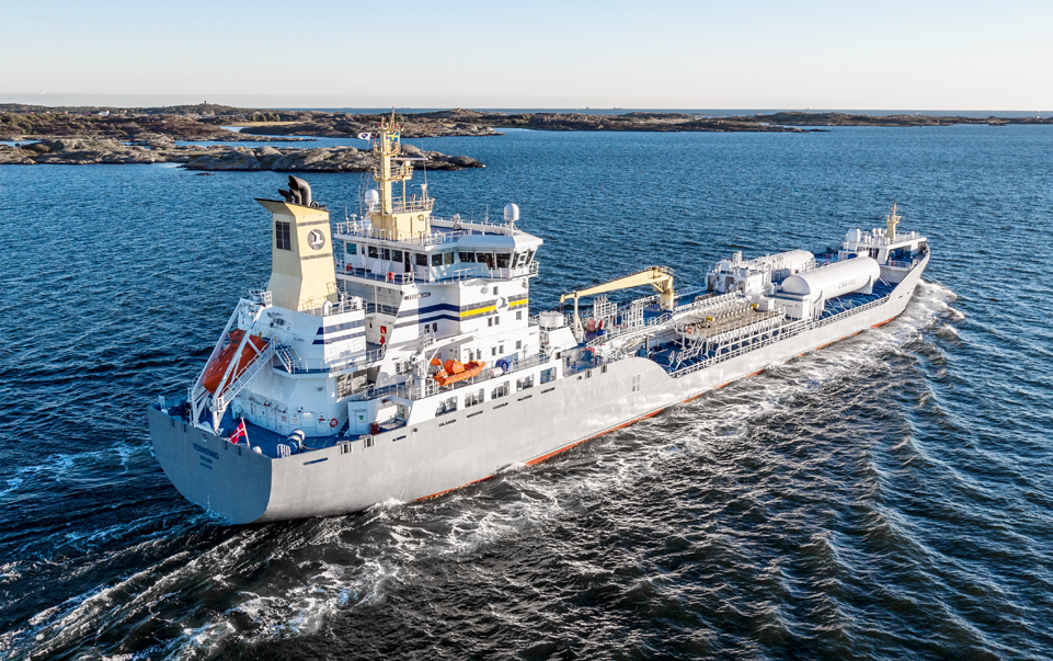 - Main Engine: Wärtsilä 5RT-flex 50 DF 5,850 kW 102 RPM 2-stroke, low pressure, LNG dual-fuel engine.